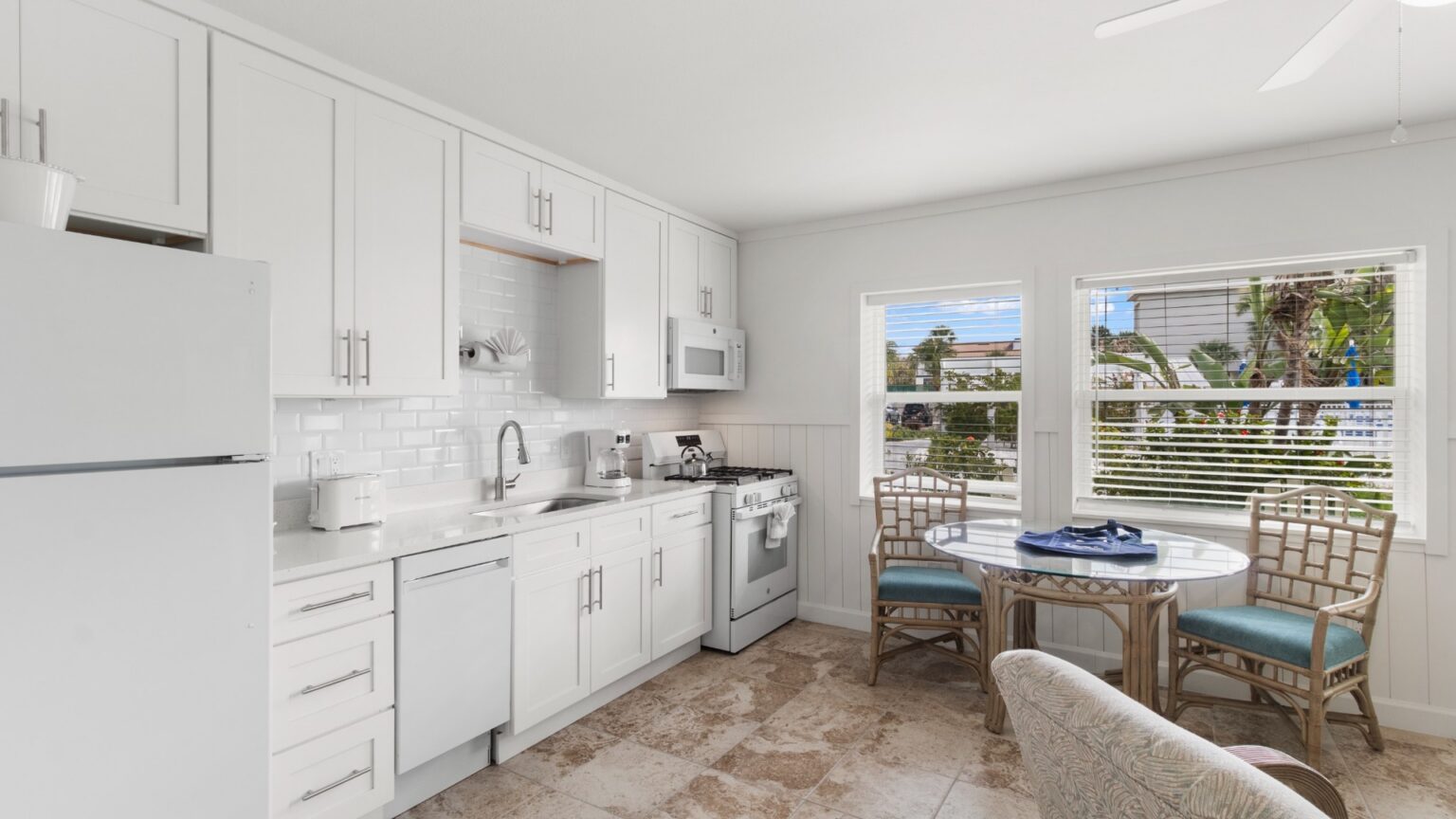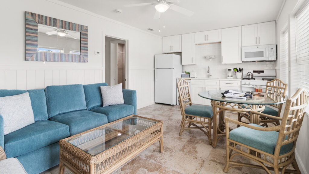 Each one-bedroom suite features a spacious living/dining room with a full-size sleeper sofa in the living area and a large patio area overlooking the resort’s heated pool. Flat screen cable TVs in the living room and bedroom, and a Blu-Ray DVD player in the living room. FREE WiFi Internet service and complimentary clean, well-maintained laundry facilities are also included. Please click on the photos below to view more information on each suite.