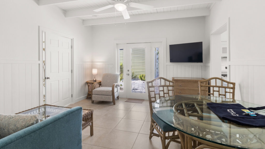 The Bougainvillea Cottage at The Wicker Inn consists of a large living room, dining room, a separate kitchen, two bedrooms and two baths. The master bedroom has a king-size bed and the second has a queen size bed. There is a full size “air dream” sofa sleeper in the living area. The bath has a shower. The private patio area, with table & chairs overlooks the pool.